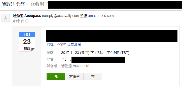 而目前的活動平台早已在幾年前注意到此點,以活動通而言,每當我報名成功一個活動,馬上就會收到活動報名成功的通知,並且還能自動加入到Google行事曆,對我這個愛好學習的人來說,其實是非常便利的!其實光是這個功能,就讓我對活動通這個平台給予肯定,因為他發現了過去我們辦活動習以為常的漏病,並針對這個環節加以改善~